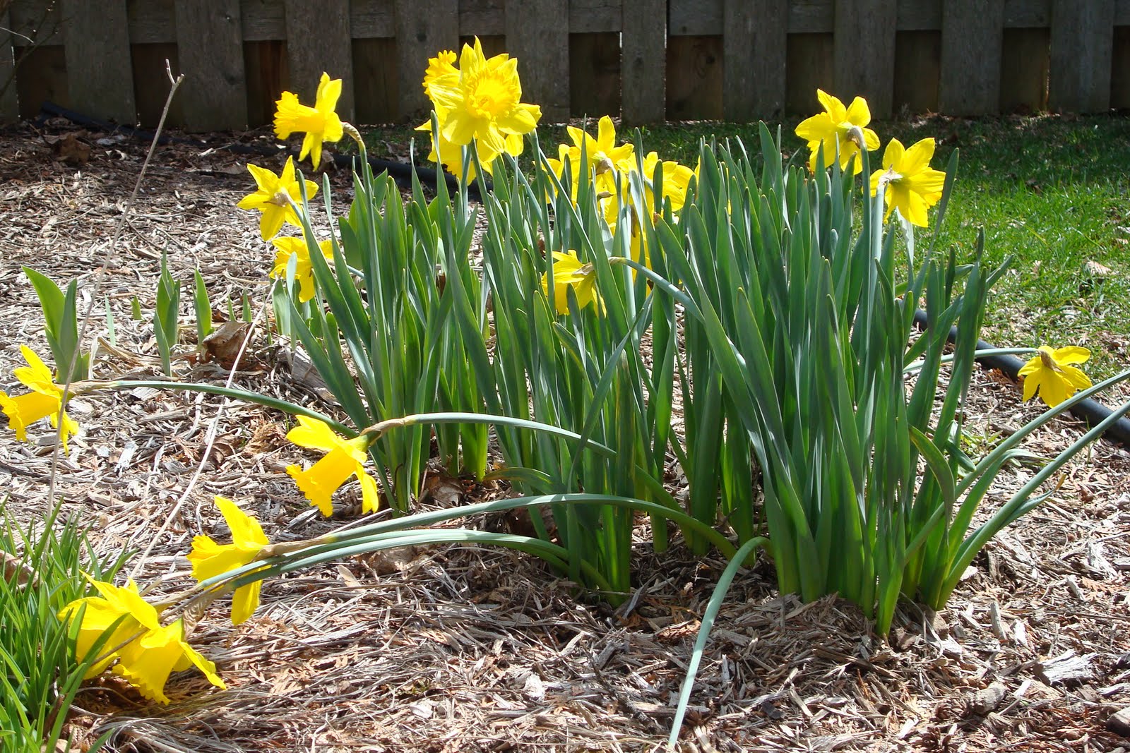Here's my daffodils again. This picture was taken a few days later, once the sun finally returned and we bid even the snow hiding in chilly shadows a happy adieu. Other than a few flowers still bending low, you'd never know most of them shivered under the white stuff only hours before.