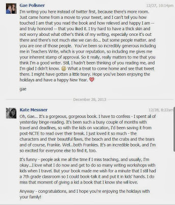 So, since it's Friday, and since I've been trying to put up at least one Friday Feedback per month, especially for those Teachers Write! campers who are still plugging away and looking for a place to connect (oooh, I get to see a bunch of you NEXT WEEK at NCTE!!), I figured today was as good a Friday as any. You know, you're all welcome, TW campers or not. Just remember THE RULES. (if you don't know the rules, they're there on that link I just gave you. Please read them!)
