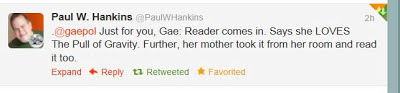 Ahh, the sometimes enjoyable juxtaposition of tweets.THIS REVIEW from Mindy at Books Complete Me. I remember being terrified of her review -- one of my first blog tour reviews -- because she loves the big splashy "wings and fangs" books that The Pull of Gravity so isn't. But, alas, she loved it too. I believe what she said is that it made her "GIDDY." And she's become one of its biggest champions. Thanks, Mindy.