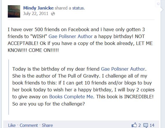 "The Pull of Gravity. This was my favorite read of 2011 and one of my favorites of all time. The characters are real, they are flawed, but they draw you in and you root for them from start to finish. Gae writes in such a way you feel like you *know* the characters, the places, and are actually a part of the story. It is real, charming, funny, and even a bit bittersweet, but definitely a book that will stay with you long after you read the last page."