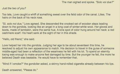 So, without further ado, this excerpt, from Martha's yet-untitled WIP, an "experimental fairy tale with a non-human narrator, which will (probably) be set in medieval Germany and post Gold Rush Seattle. As with THE GAME OF LOVE AND DEATH," Martha adds, "Music, truth and love are core elements of the story."
