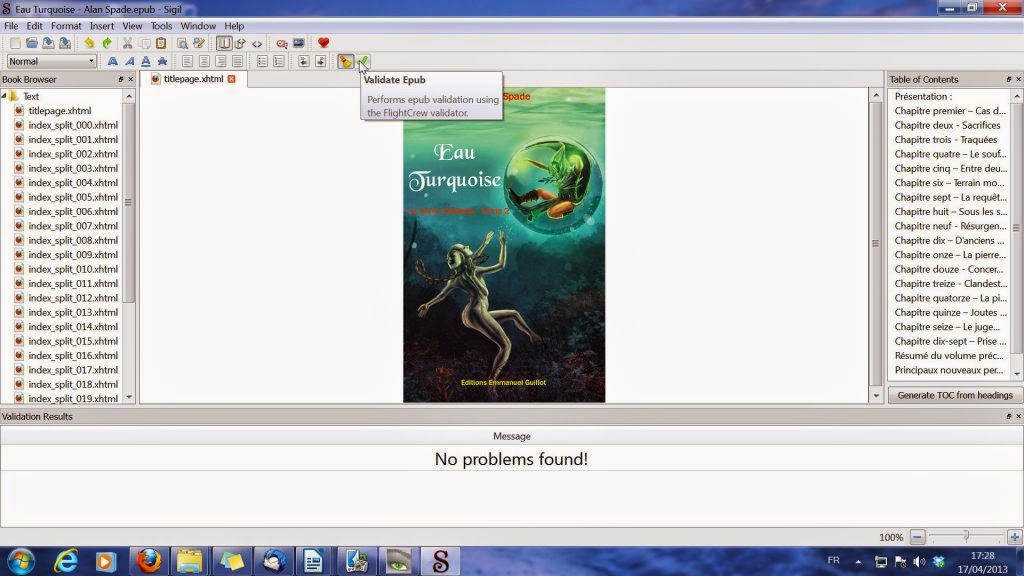 Sigil vous permet aussi de vérifier vos epubs, pour être sûrs qu'ils seront acceptés au niveau qualité technique, notamment par Apple. Cela ne préjuge cependant pas du contenu, et ne vous dispense en rien de le vérifier.