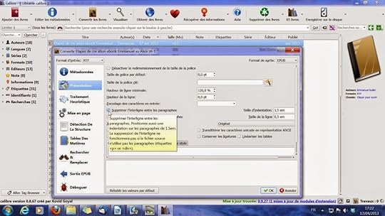 Il me suffit ensuite de créer tous mes titres de chapitres (juste les titres de chapitre, pas les chapitres entiers) à l'aide des feuilles de style en titre 1 (en limitant la police de caractère à la taille 14, les tailles supérieures n'étant de toute façon pas gérées par les ebooks) pour obtenir un chapitrage automatiquement. Je rentre les métadonnées, je laisse les préférences par défaut, je lance la conversion et c'est magique, tout se fait tout seul (l'epub est créé dans le même répertoire que celui du document converti). C'est une solution ultrasimple une fois que le plugin est installé, plus encore que de définir des hyperliens sous Word.