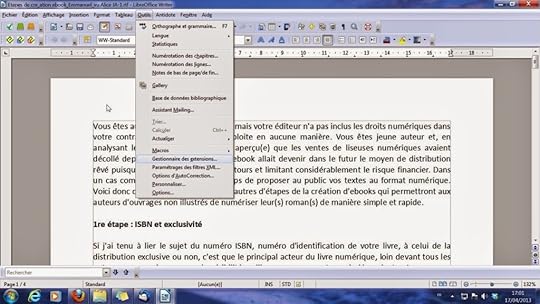 Pour cela, je suis allé récupérer le plugin Writer to ePub sur Internet. Puis dans l'onglet "Outils" de Libre Office, en sélectionnant "Gestionnaire d'extensions", je l'ai ajouté.