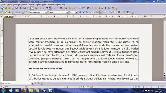Vous êtes auteur édité de longue date, mais votre éditeur n'a pas inclus les droits numériques dans votre contrat d'édition, ou ne les exploite en aucune manière. Vous êtes jeune auteur et, en analysant le marché, vous vous êtes aperçu(e) que les ventes de liseuses numériques avaient décollé depuis 2011 en France, que l'ebook allait devenir dans le futur le moyen de distribution rêvé puisque ne comportant pas de retours et limitant considérablement le risque financier. Dans un cas comme dans l'autre, il est temps de proposer au public vos textes au format numérique. Voici donc quelques exemples parmi d'autres d'étapes de la création d'ebooks qui permettront aux auteurs d'ouvrages non illustrés de numériser leur(s) roman(s) de manière simple et rapide. [Article déjà paru sur le site