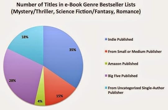 - les auteurs autoédités publient davantage de livres dans les genres concernés (2ème tableau) que les cinq plus gros éditeurs, mais pas beaucoup plus: 35% pour les indépendants contre 28% pour les gros éditeurs. Qu'est-ce que j'en déduis? Que tous ceux qui disent que les auteurs indépendants envahissent le marché avec des torrents d'ebooks feraient mieux de balayer devant leur porte. La surproduction est d'abord le fait des gros éditeurs. Si on ajoute les petits et moyens éditeurs et les gros éditeurs, les autoédités sont derrière. Oui, vous avez bien lu, les autoédités publient moins d'ebooks que les éditeurs.