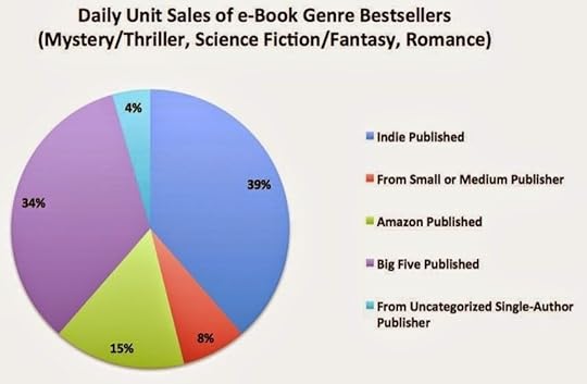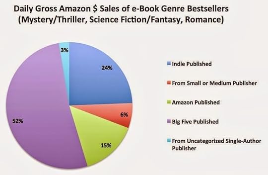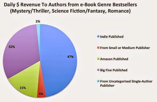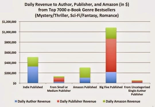 - en comparaison des autres auteurs, les auteurs autoédités représentent 47% du revenu journalier. Pourquoi un chiffre aussi important? Parce qu'Amazon se montre généreux sur sa redevance d'auteur aux autoédités. Amazon est d'ailleurs tout aussi généreux avec les auteurs publiés par ses maisons d'édition internes. Les auteurs des cinq plus grosses maisons d'édition ne récupèrent que 32% du revenu journalier, alors même que leurs maisons d'édition captent 52% des profits! Ils se font clairement avoir. La vraie question est pour eux de savoir si les ventes papier compensent ces sacrifices. Pour les best-sellers, sans doute, mais pas sur Amazon.com, en tout cas, étant donné le faible nombre de livres papier désormais vendus sur Amazon.com (en tout cas sur cette période de l'année, n'oublions pas les précautions d'usage).