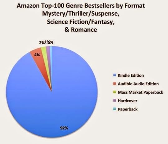 Il faut garder à l'esprit que les statistiques seront forcément plus favorables aux ventes d'ebooks, puisqu'Amazon pousse à fond les ventes d'ebooks, et puisque les domaines étudiés (genres littéraires) sont très "perméables" à l'ebook aux Etats-Unis. Les stats seront aussi plus favorables aux autoédités, qui se débrouillent beaucoup mieux dans les genres de fiction étudiés que dans les genres purement littéraires, ou historiques, ou religieux, entre autres.