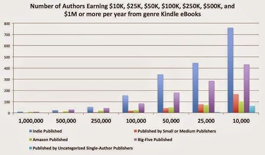 - le graph suivant est frappant en ce qu'il montre que l'autoédition est clairement le chemin vers les ventes le plus viable pour les autoédités, si l'on ne prend que les ventes d'ebook. Evidemment, il faut aussi prendre en compte le papier, ce qui n'est fait que sur Amazon avec cette étude, c'est à dire de manière très imparfaite.
