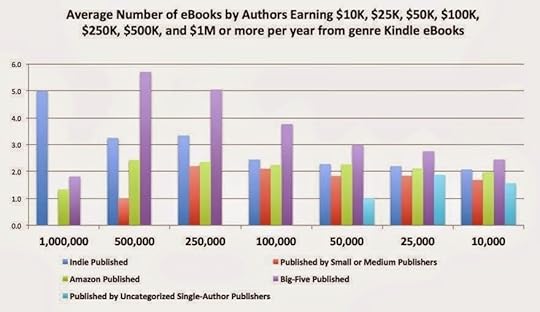 - le dernier graphique montre que les auteurs autoédités qui vendent le plus doivent produire davantage de livres. Mais plus on s'éloigne des bestsellers ayant gagné 1 million de dollars sur un an, plus on se rend compte que les auteurs traditionnels doivent publier davantage de livres pour obtenir une somme équivalente aux auteurs autoédités. Là encore, c'est un mythe qui s'effondre: la surproduction vient bien des éditeurs.