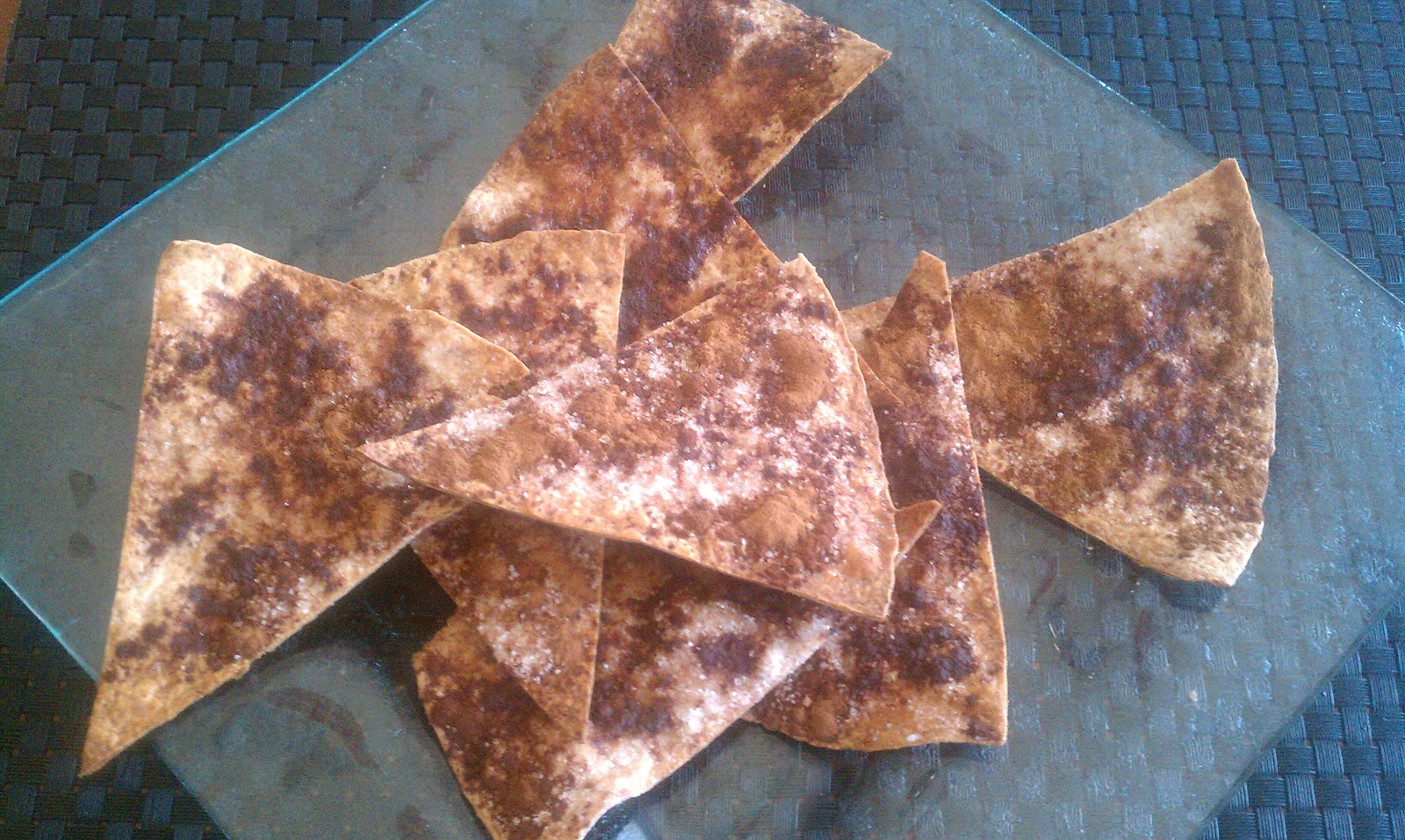 2. Spread your tortilla evenly with the coconut oil. Cut into eight wedges (like a pizza). Sprinkle evenly with the sugar, then the cinnamon. Spread out on a baking sheet.