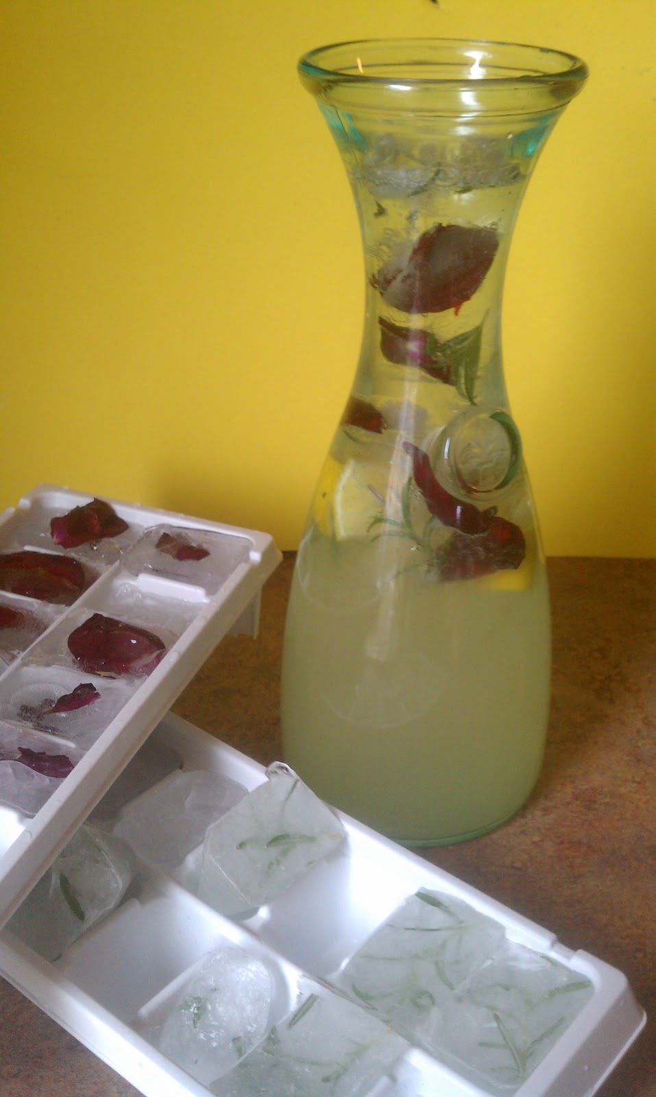 Today, I was in the mood for some pretty! I also wanted to use up a bunch of organic lemons (those things go bad way too fast). So, my daughter and I whipped up a batch of lemonade. But not just any lemonade! I also had a rose that was dead (there's no great way to say that) and lots of rosemary growing in a pot indoors. Not to mention the fact that I love fun, vitalizing, low-to-no calorie beverages. So, voila! This idea was born.