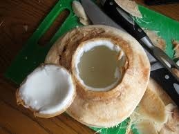 How to open said magic fruit? All you'll need is confidence and a very big knife. Towards the top (say, 2 inches down from the peak), jab with your knife. You may have to do this a few times til you break the surface. Continue to do this all around the top in a circle til you can remove the top. From there, you'll pour out the water and then spoon out the freakishly tender coconut meat (with, yes, a spoon). And be sure to sample a bit of the meat before you blend it up...it's heavenly!!