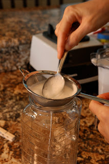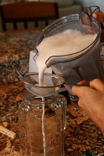 5. Pour the almond milk through the strainer into the container to remove the pulp. My daughter totally loves doing this and begs to "un-pulp the milk."