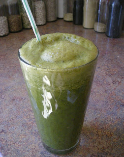Greetings, friends! Today, I'm busy cooking up lots of healthy treats for the Two-Week Wellness Solution, as we start today. Woot! If you want to join in, please connect here on my Facebook page. Anyhoo...part of the program (and the way I try to eat in general) is to include tons of fresh veggies. As I recently got a vitamix, I've been experimenting with green smoothies a lot. However, I also wanted to create a green smoothie that was veggies-only. So, today I hit the jackpot! Using the fresh kale I just scored from my friend's garden, I supercharged this drink with five incredibly vitalizing, fiber-rich, nutrient-dense veggies.