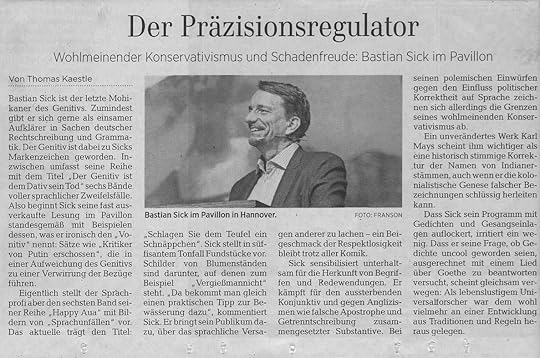 mit großem Genuss haben wir 5-köpfige Familie am vergangenen Donnerstag Ihre Lesung verfolgt und stellenweise buchstäblich Tränen gelacht. Getrübt wurde das Erinnerungsvergnügen im Nachhinein durch eine mäkelige Rezension in unserem Lokalblatt, der HAZ, die zwar Ihre sprachliche Expertise würdigte, ansonsten aber unverhohlen Ihre fehlende Unterwerfung unter die Knute der political correctness anprangerte. Unser Rat: Verzichten Sie auf die Lektüre dieses „Geschwurbels“ (so sagt man heute wohl), und falls Sie sie nicht vermeiden können, dann wenigstens machen Sie sich nichts daraus. Kulturredakteure müssen sich heutzutage offenbar derart anbiedern, um in ihrer Szene zu gelten, auch wenn der Durchschnittsbürger dem verständnislos gegenübersteht. Wir jedenfalls und alle (nicht wenigen) anderen, mit denen wir gesprochen haben, fanden Ihre Lesung ausgesprochen vergnüglich, auch und insbesondere Ihre Absage an die Auswüchse einer missionarisch übersteigerten p.c.