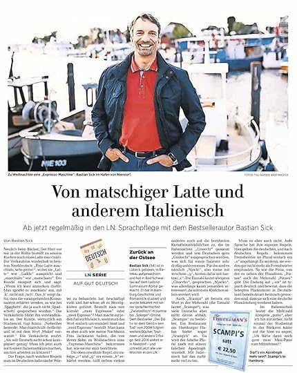 Auf gut Deutsch: Neue Kolumne des Bestseller-Autors Bastian Sick in den »Lübecker Nachrichten«. Der erste Beitrag vom 25.12.2019 trägt den Titel: »Von matschiger Latte und anderem Italienisch«. Klicken Sie auf das Bild oder hier, um sich den Beitrag in gut lesbarer Größe anzeigen zu lassen.
