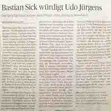 Ankündigung einer Veranstaltung der Evangelischen Akademie Düsseldorf anlässlich des fünften Todestages des Sängers, Komponisten und Entertainers Udo Jürgens mit Bastian Sick.