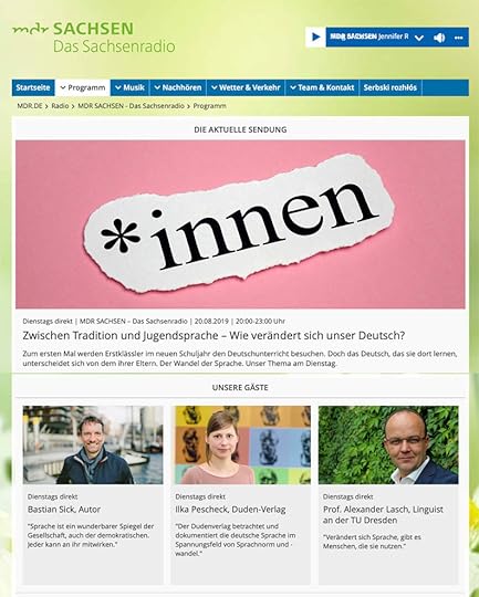 Dienstagabend (20.8.2019) unterhält sich mdr-Moderator Thomas Lopau mit den Gästen Ilka Peschek (Duden-Verlag), Professor Alexander Lasch (TU Dresden) und Bastian Sick (»Der Dativ ist dem Genitiv sein Tod«) anlässlich des Schulbeginns in Sachsen über den Wandel in der Sprache, über Modernismen, Jugendjargon und von »Politiker*innen« erzwungenes »politisch korrektes« Deutsch. Die Sendung dauert drei Stunden, es gibt also viel Redezeit.