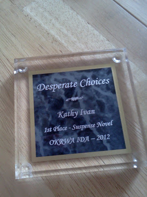 I also received my lovely paperweight for Desperate Choices first place win in the OKRWA International Digital Awards (Suspense). Here's a picture.