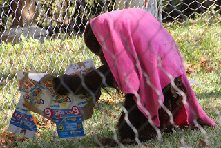 I wish I could have made the fence go away, but it wouldn't. LOL So here is the juvenile orangutan eating from a box. Not sure if it's female or male, but someone who was watching it, said the monkey has worn blankets since it was a baby! :) I wonder if she will ever outgrow it! I'm taking a wild guess that it's a she because the blanket is pink.