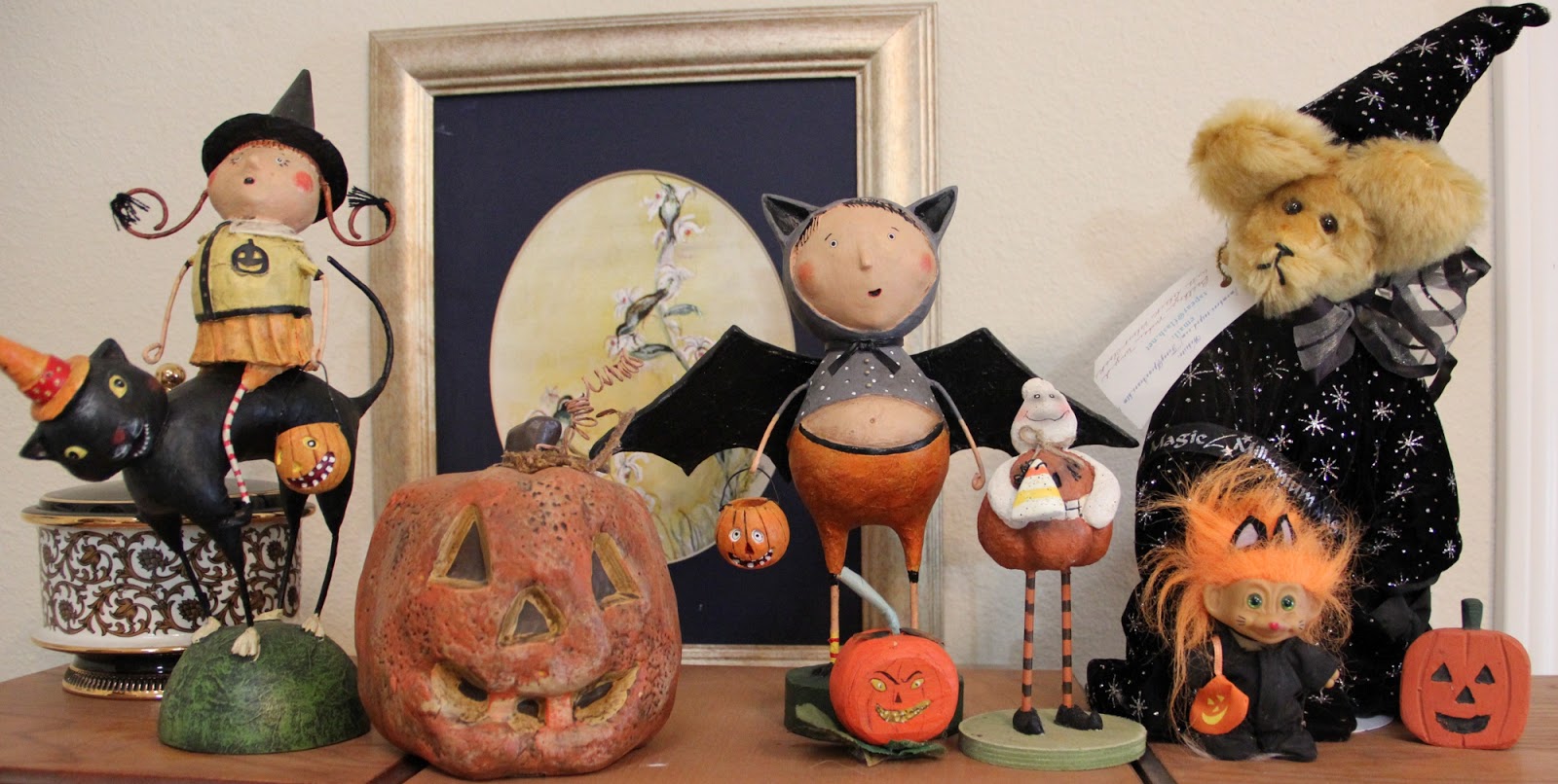 Remember when we were talking about troll dolls? See the troll dressed as a black kitty cat and carrying her own jack-o-lantern trick-or-treating bag? I got it for my daughter years ago because of her red hair and she was a black kitty cat one year! But guess who kept it??? The wizard bear I created. And my parents made the two little wooden jack-o-lanterns!