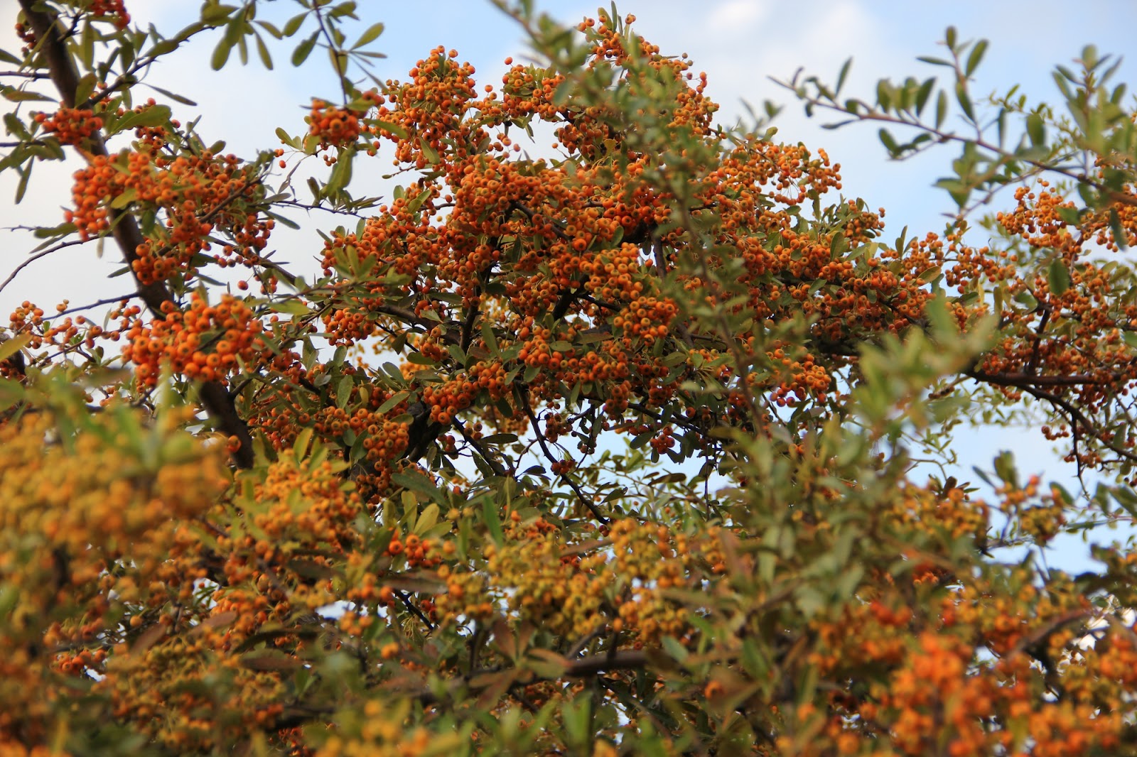 The first picture was taken of the pyracantha on Oct 1. As you can see the berries are just beginning to turn. I love them because for fall and pumpkin time, they change from green to...