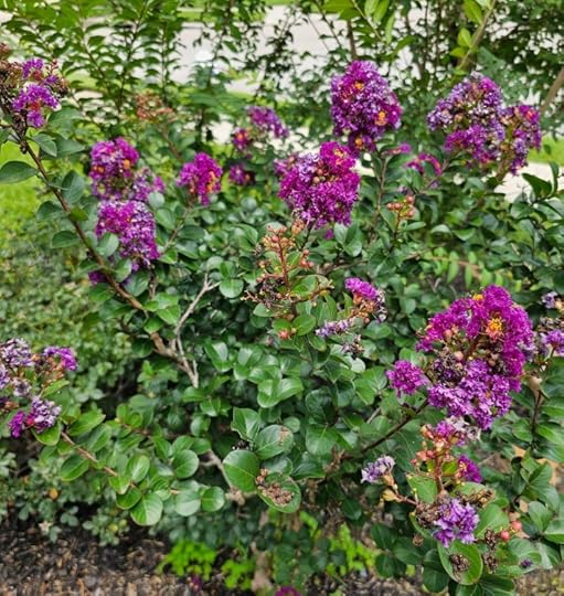 I love purple flowers so when I found crepe myrtles in purple, I had to get them. Four of them. They are miniatures so they only get to about 4-6 feet tall, whereas the others can get to around 20-40 feet tall.