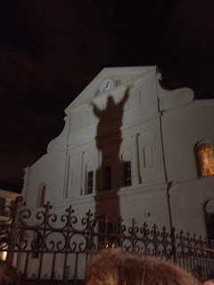 Impressive shadow of statue on the cathedral. Behind us, the cathedral was haunted, and in front of the part of the cathedral that is pictured, two girls were drained of their blood and left on the front steps. They had tried to get into the upper windows of the building behind us where ghosts are purported to exist, but were thrown out and told they'd be arrested. Then they had video equipment they were going to use to identify the ghosts in the upper floors, but their equipment was smashed and they were murdered, but no indication how they could have been drained of all their blood.