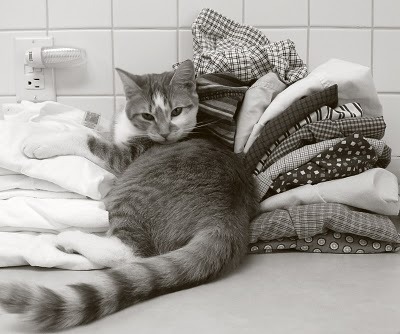 Or we can add a pet to the equation--I had cats and dogs...and they did make doing the chores more of a fun challenge. Though these are not my cats--they represent just what my cats would do--curl up on my freshly washed laundry, or even before it was washed. Tackle the mop as I tried to sweep it across the floor. Dig up my newly planted flowers or bulbs and roll in them.