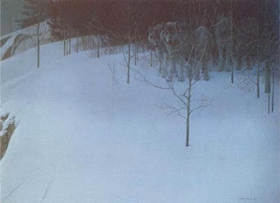 " I do not mean this to be a frightening picture. The wolves, which normally avoid eye contact, are staring straight at you. Although they sense your presence, they can't quite make you out. They are alert and interested, but not about to attack. They are equal to the viewer; they are on the same level. The feeling of slight tension and respect between you and them is mutual . You are in their domain. Now that they know about you, the will melt into the gloom."
