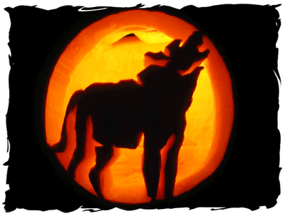 Don't you just love the pumpkins nowadays? I was lucky if I could carve a couple of triangle eyes, nose and a bunch of pegged teeth. But now? Well, it's like me and drawing. Stick figures is about all I can manage! So I leave the pumpkin carving to wizards who can create an impressive howling wolf! But I must say that the person who did might be a werewolf. Takes one to know one, right? :)
