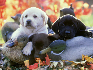 Yellow and black Labrador Retrievers...we used to have a yellow! There's a cute little chocolate one too, nearly buried by the black and yellow and ducks. :)