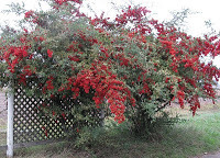 This is pyracantha in the fall--the red berries attract numerous birds, including cardinals. They're beautiful and perfect for nesting. But, they also have tons of white flowers in the fall and attract butterflies and hornets! And they have long wicked thorns. Can you say beauty and the beast??? Wicked to mow around.