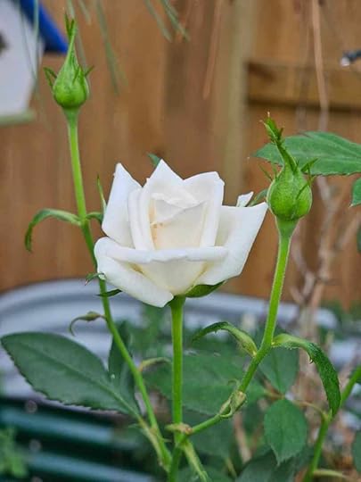 Miniature White Roses in the Garden. When I brought them home, they were so tiny. They’re now about 4 feet tall, but they don’t get any bigger than that. I love roses. And they seem to do really well here.