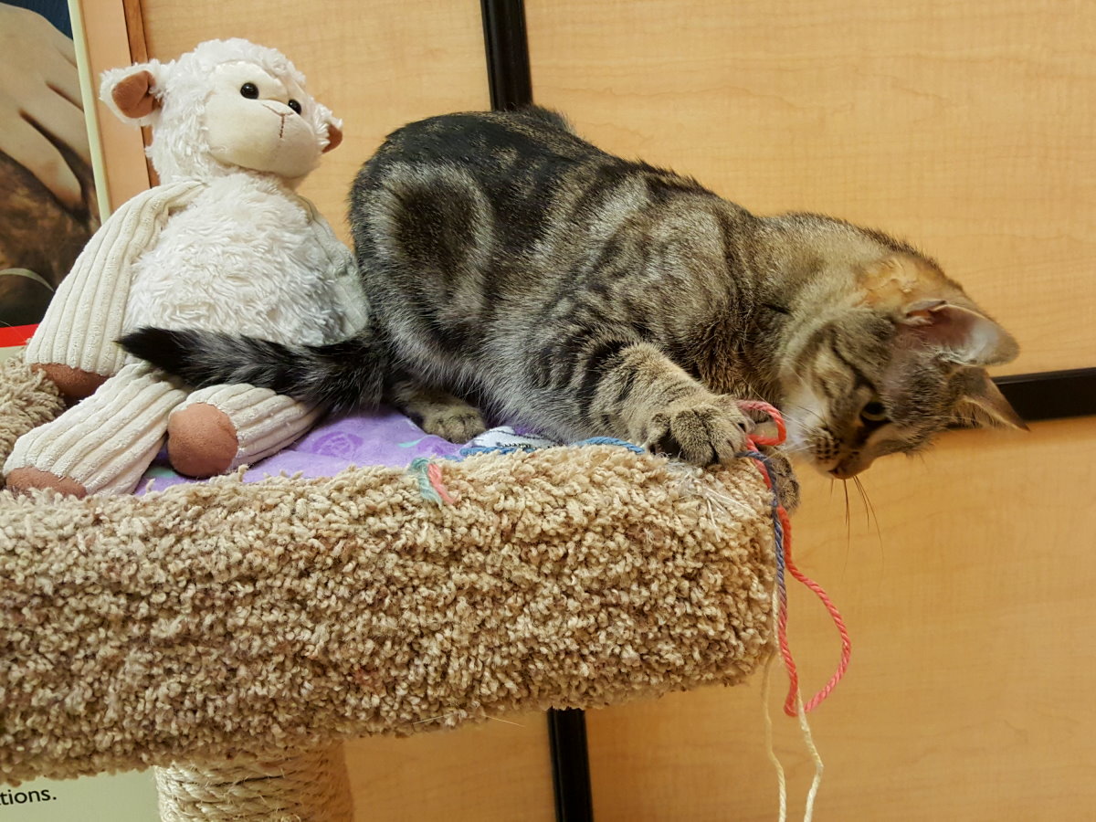 PEETIE is getting better at the walks — he no longer tries to get under shelves or the like (Sheela’s also much better about this). But he is undecisive. When put down he’ll go back and forth up and down the same row, unable to decide where to go next. He is getting better at recognizing how to get back to the cat-room from pretty much anywhere on that side of the store. He saw some dogs and, while not pleased, stayed calm enough. He also purred for me back in the room, and enjoyed the string-and-chain game.