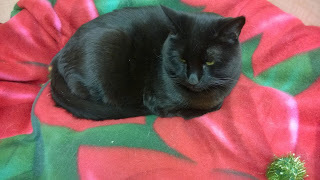 SHEENA is big, black, and placid and wants to be left alone by the other cats so she can enjoy her favorite place, a blanket atop the bins just outside her cage. She's what I call a lazy predator in that later on she rolled onto her back and enjoyed a game of laser pointer, happy as a clam so long as she didn't have to actually get up and move around.