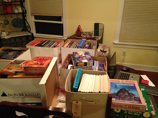 Note the disgruntled cat (not one of ours) as he surveys the boxes of old rpgs.