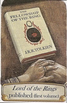 But the card that really got my attention when it came up last night was "LORD OF THE RINGS PUBLISHED (FIRST VOLUME)", accompanied by a picture of THE FELLOWSHIP OF THE RINGS. They even got the right dust jacket for the first edition Allen & Unwin hardcover and, of course, the date [1954]. Nice to see Tolkien's book ranked with things like THE DISCOVERY OF THE ASTEROIDS and INVENTION OF THE LIGHT BULB.