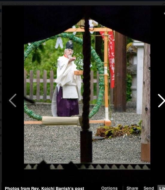 Pictures! Of these three photos, the first shows the Shinto priest, the second shows the back of my head in the foreground, and the third shows us both stepping through the CHI-NO-WA, or big green woven circle; Sig and Anne can be seen in the background through the circle.