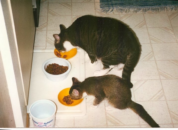 #1. two cats with two bowls = harmony. Or, little cat see, little cat do.