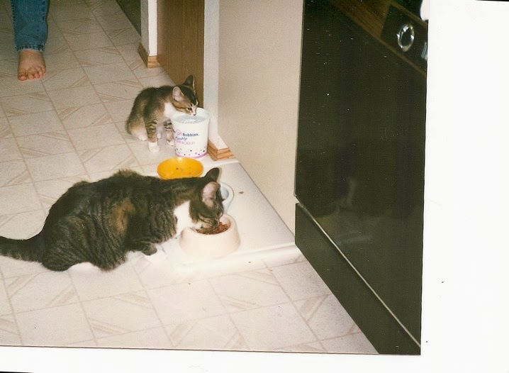 I've already shared the news that we lost little RIgby, our senior cat, last Friday. I've been meaning to write up a remembrance of her but find I can't bring myself to do so -- too many good memories to choose from, too much grief at the sudden finality of it all. So instead I thought I'd share some photos Janice turned up a few weeks back, of Rigby and Parker together when she was just a little kitten who'd newly joined our household. My memory said that they didn't get along at first, and it was only through a mutual admiration for sitting in Janice's lap, and working out a way they could both do so at the same time while not officially taking cognizance of the other's presence, that they gradually came to terms with each other. I see from these photos that this was not altogether the case: that Parker showed her the ropes from early on and was much more tolerant of giving up his only-cat status than I remembered.