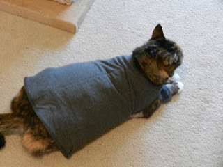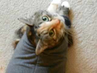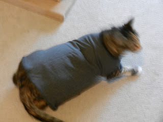 So, Hastur, our middle cat, has her struggles -- overweight, painfully shy around strangers, overgrooms to the point where her belly is completely bare of fur. And from time to time we try things that might help: changing to non-hyper-allergenic catfood, plugging in relax-a-cat air pheromones, and most recently buying her a thundershirt.