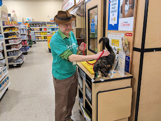 Next up the two kittens, FLEECE & FLANNEL, wanted attention but were too shy to come out, especially the lighter, fluffier one. So they played in their cage. They liked the smell of catnip but best of all were gopher games involving sticks and strings, especially the chopstick. I snatched up the bolder of the two (the darker one) to let him explore. This led to difficulties. He dashed around the room, too skittish to let me pick him up and unsure whether he cd make make the leap back up into his cage on his own. We resolved the problem by putting one of the large, hard-topped cat-carriers with a towel on top just outside (below) his cage. That did it: he jumped from floor to carrier-top to inside his cage, I think pleased with himself. His partner had no adventures, which is probably just as well.