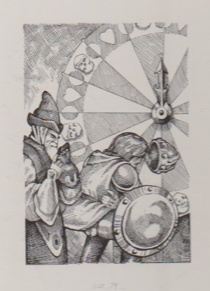 That said, here are two more pieces from the same little stash, the first of which is definitely from THE GATES OF FIRESTORM PEAKE; it's by Arnie Swekel (as were at least two of the three pieces in my last post) and cost the kingly sum of $3. The second I'm think is unassociated: simply something I picked up at artists' row outside the GenCon dealers' room circa 1996 or 1997.