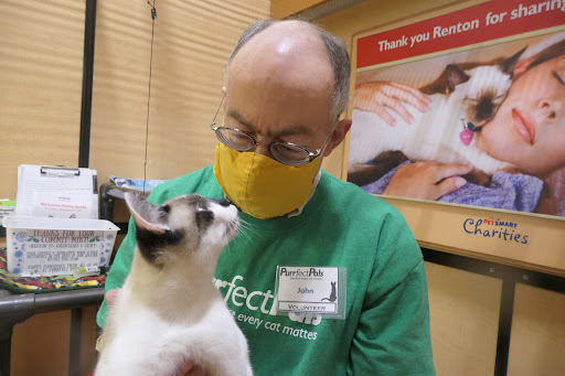 Other activities: — several times a cricket came into the room (had there been some Great Escape over near the fish?) and immediately regretted it.— Pisces at one point began to bite the bag of food atop the bin, ocasionally racing the length of the room and pouncing on it— Sirius loves to roll in the sandbox, which he treats like a toy. I expect that behavior will go away once he has a home and box of his own.— an Ex-Volunteer came by with a bag of cat-blankets; I put these by the bench.— Pisces has a distinctive chirp when he talks.