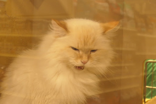 That left our little sandy lions, one longhaired (Simba) the tother shorthair (Zoey). SIMBA got half an hour, filled with lots of petting: he walks up to people and invites attention. Between his sunny disposition and beautiful long fur he was much admired. At one point he was in the perfect pose: on the store’s main aisle sitting next to the red ‘Adopt’ sign with an arrow. Unfortunately I couldn’t take a picture and manage the leash at the same time.