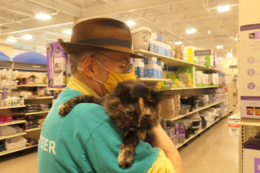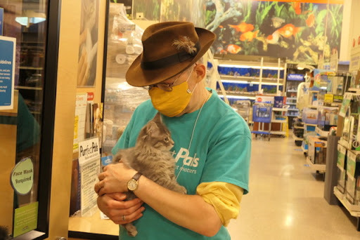 The three two-month kittens, Naveen and Ariel and Tiana were shyer than I expected. They were shy of being picked up or of my approaching them but on their own they played and explored and hide and pounced as kittens should. Toys that had a little distance also got the many-toed thumbs up. Naveen had an admirer who wanted to adopt him then and there: I showed her the Q-code and encouraged her to send in a query to Arlington right away, which I think she did.