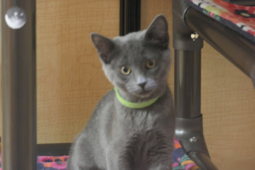 Quite a crowd in the cat room today, even with the two sisters/bonded mother cats pair (Willow and Maple) having already been adopted. We had senior pair TIKA and KINDA, young LEO DECATI, little ROCKY ROAD (the solitaire kitten, off in a cage of his own), and eight little grey kittens — some light grey, some dark as black; some smooth, some with a bit of fluff; all adorable.