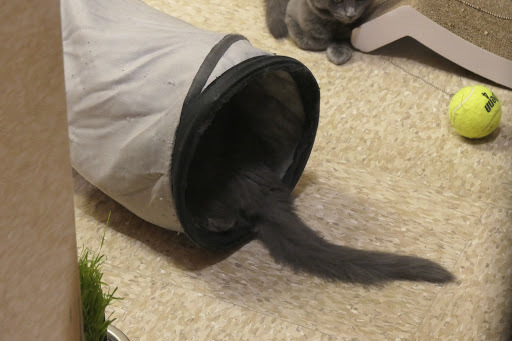 Then it was Kitten Time. I took them out of their cages one at a time and gave them the run of the place. After that it was kittens everywhere. I liked how they have distinct personalities already in what toy each likes, favorite spots to hide in, tolerance at being petted, and the like. Little Road kept to himself, except when one or two of the grey kittens sought him out to see what game he was playing. He likes to seek out interesting places —say, beneath the cushion atop the bins.